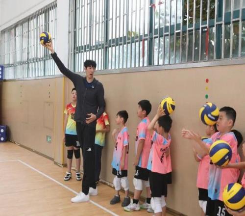 活動的高潮,是張哲嘉老師帶來的 “冠軍體育課”。他沒有直接開始訓練,而是先幫同學們梳理基礎:“練排球先練‘腳’,腳步要先到位,走到接球的位置,再伸手去接,千萬別急著抬手。” 隨後,他親自示範顛球、接球、發球的動作,手把手糾正同學們的姿勢 —— 有的同學顛球總掉,張老師就蹲下來教他調整手型;有的同學發球沒力氣,他就指導如何借助身體的力量。最後,張老師還組織同學們模擬比賽陣型,練習 “一傳、二傳、扣球” 的配合,盡管同學們的動作還略顯青澀,但每一個人都全情投入,操場上滿是笑聲與汗水交織的美好畫麵。
