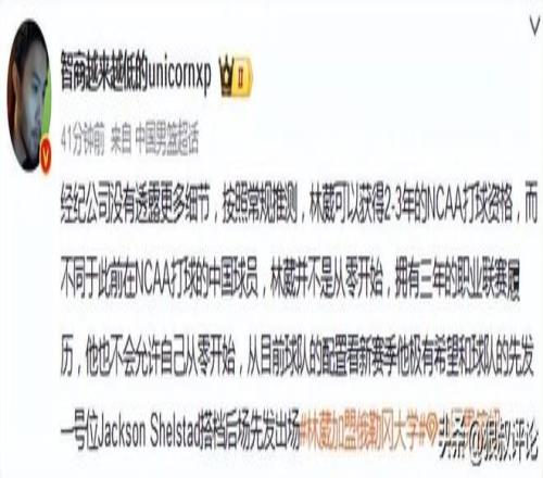 媒體人王健發文點評:經紀公司沒有透露更多細節,按照常規推測,林葳可以獲得2-3年的NCAA打球資格,而不同於此前在NCAA打球的中國球員,林葳並不是從零開始,擁有三年的職業聯賽履曆,他也不會允許自己從零開始,從目前球隊的配置看新賽季他極有希望和球隊的先發一號位Jackson Shelstad搭檔後場先發出場