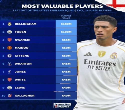 英格蘭隊公布了最新一期球隊大名單,德轉盤點了本次未能入選的球員身價榜(受傷球員除外)。