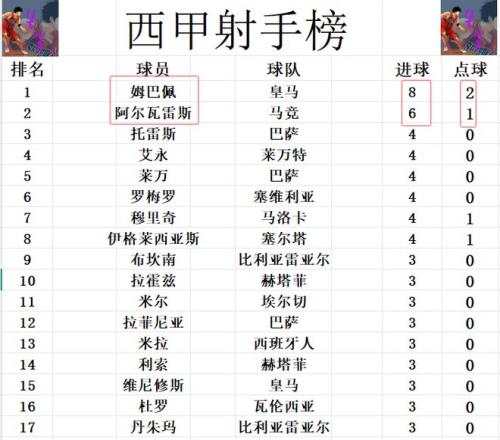 射手榜方麵,姆巴佩8球繼續領跑,阿爾瓦雷斯2球之差緊隨其後。托雷斯,萊萬,穆裏奇,羅梅羅等人4球並列第3。維尼修斯,居萊爾,拉菲尼亞,米爾等人3球剛好擠入前十。馬拉約爾今天打入一球,但還差1球才能進前十。