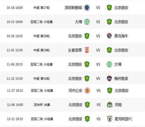 國安接下來回聯賽扮演“生死判官”!10月18日聯賽第27輪,客戰深圳新鵬城,10月23日亞冠二級第三輪客戰大埔,10月26日聯賽第28輪,主場迎戰青島海牛,11月1日第29輪客戰長春亞泰,11月6日,亞冠二級第四輪,主場和大埔進行背靠背比賽,11月22日聯賽末輪,主場迎戰梅州客家。