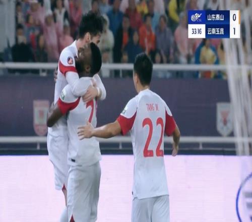 第33分鍾,雲南玉昆再次打出精彩反擊,奧斯卡戲耍洛佩斯,將球送到後點,侯永永頭球破門,0:1!山東泰山占盡優勢的情況下,意外落後了。