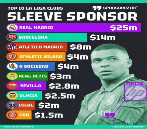 根據Sponsorlytix的一項研究,西甲當中有17家俱樂部通過球衣袖標讚助獲得了收入,而合同金額最高的10支西甲球隊總金額達到6680萬美元。