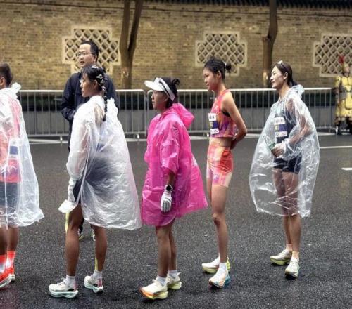 精英熱身區裏,朱卿、黃菲、潘素芳、李春霞等十位特邀精英穿著羽絨服,來回折返做著賽前的熱身跑以及動態的熱身訓練。存衣完畢後,她們換上背心短褲披上雨衣,在等待身份檢驗的間隙不斷活動著身體以保證剛熱身開的肌肉保持彈性。