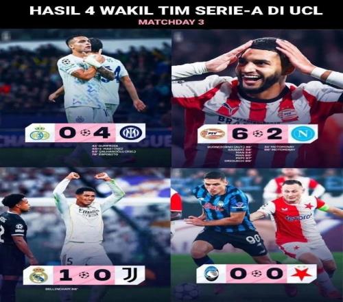 三輪歐戰踢完,國米進9球失0球的穩定表現拿到三連勝,目前排在積分榜第3位,而其他三支球隊亞特蘭大、那不勒斯和尤文分別得到4分、3分和2分,排在第17、23和25位。歐聯中的博洛尼亞以4分排在第18,羅馬更是隻拿到3分排在第23位。歐協聯隻踢了兩輪,佛羅倫薩目前兩戰全勝積6分排在榜首。