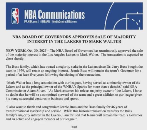 NBA官宣,理事會一致同意批準馬克-沃爾特收購湖人。