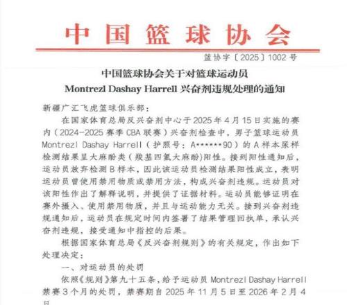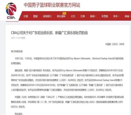 11月6日,籃協公布對上賽季新疆隊外援哈雷爾的處罰,由於興奮劑違規問題,哈雷爾被CBA處禁賽3個月,時間是2025年11月5日至2026年2月4日。球隊方麵,新疆隊需要承擔20例興奮劑檢測的費用36000元;對於新疆隊的隊醫、醫療與反興奮劑負責人吳傑警告處分。