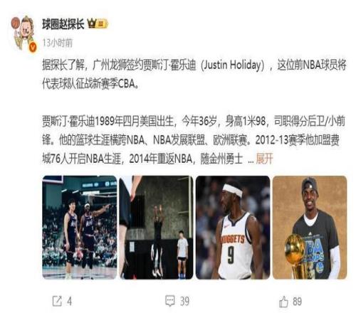 根據國內知名籃球媒體人“球圈趙探長”的報道,NBA冠軍後衛、賈斯汀-霍樂迪新賽季將加盟CBA廣州龍獅隊。上個月的NBA季前賽,賈斯汀-霍樂迪代表廣州龍獅隊出戰3場比賽,場均可以拿到5分3籃板2助攻2搶斷的數據。2014-15賽季,霍樂迪隨勇士隊拿到了1枚總冠軍戒指。