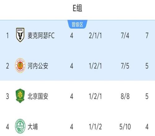 4輪過後的小組最新排名,北京國安憑借著首勝終於擺脫墊底,與河內公安同積5分,因淨勝球劣勢暫時排在小組第3,同時將大埔隊擠到小組墊底。麥克阿瑟FC憑借著2勝1平的戰績積7分,反超河內公安排在小組第1。