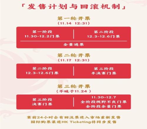 第二輪次門票將於11月17日開售,計劃釋放剩餘循環賽門票以及60%半決賽場次門票;第三輪次門票將不晚於11月24日開售,預計釋放所有場次視野遮擋門票、剩餘半決賽門票以及全部決賽門票。