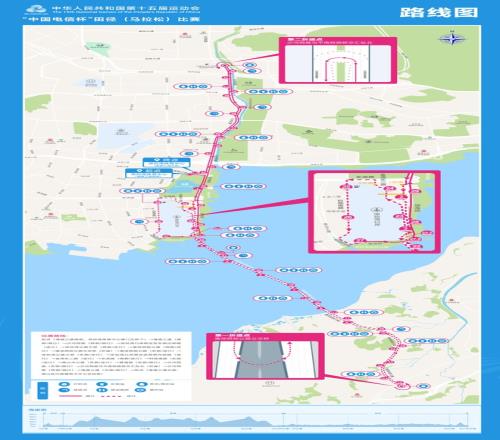 十五運會的馬拉鬆賽道是全運會史上首條跨境賽道,起終點均設在深圳灣體育中心旁海德三道。其中深圳段約20.354公裏,位於南山區和前海。香港段約21.841公裏,位於元朗區。選手們要經深圳灣公園,過深圳灣口岸進入香港,沿港深西部公路至折返點後返程,再經東濱路、前海路等回到終點。
