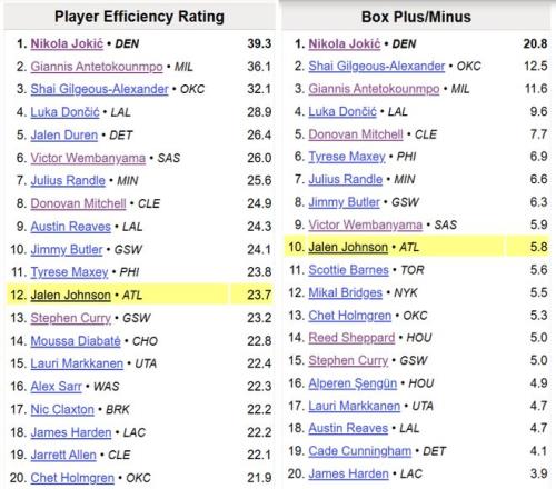 高階數據方麵,也能看出傑倫約翰遜正在展現一些不同的東西:目前傑倫約翰遜的PER值是23.7、BPM是+5.8,這兩項都是生涯最高(此前最高PER值17.3、BPM+1.9),而且分別排在全聯盟第12和第10。