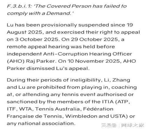 按照ITIA規定,禁賽期間三位選手被禁止參與、執教或出席任何由ITIA成員及各國網球協會授權的賽事,這一禁令覆蓋了全球所有頂尖網球賽事。