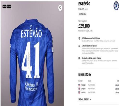 切爾西球員帕爾默與埃斯特旺成為該平台上的熱門人物。帕爾默在去年對布萊頓比賽中攻入四球的那件球衣最終以34411英鎊成交,而埃斯特旺在對阿賈克斯比賽中打進個人第一粒歐洲冠軍聯賽進球的球衣則賣出29100英鎊。
