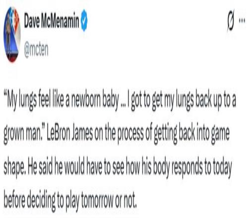 詹姆斯表示,會根據今天身體的反應,來決定明天是否出戰。詹姆斯還說恢複到成年人的體能水平,隻有通過上場比賽才能實現。