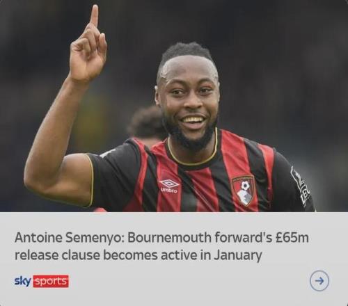 天空體育消息,塞梅約和伯恩茅斯的合同中有價值6500萬英鎊的違約金條款,且明年一月份就會生效。