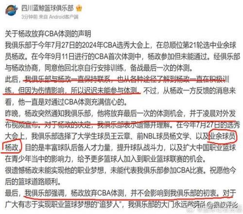 四川男籃也在官方聲明當中提到楊政是“業餘”球員等爭議字眼,涉及到遲遲未能通過體測引發比較大的爭議,甚至一度成為CBA選秀最大爭議話題。