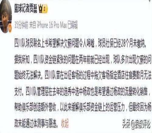 北京時間11月19日,根據籃球記者“賈磊的”報道,四川隊球員聯名上書希望解決欠薪問題令人唏噓,球員社保已經28個月未繳納。