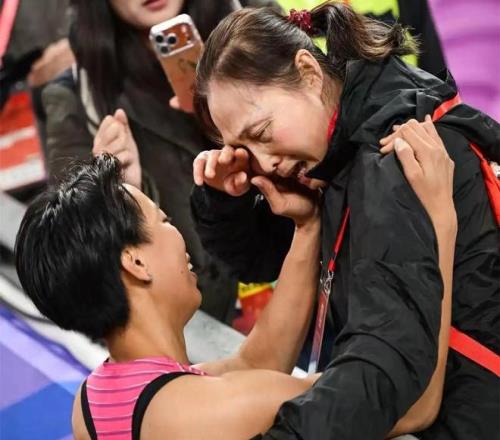 奪冠之後的劉景揚第一時間奔向看台和媽媽緊緊擁抱。媽媽熱淚盈眶,她非常激動地說著:“她連教練都沒有,她太艱難了,沒有人看好她,你們不知道她很不容易。你知道她經曆了多少嗎?人家都不看好她。太不容易了。”