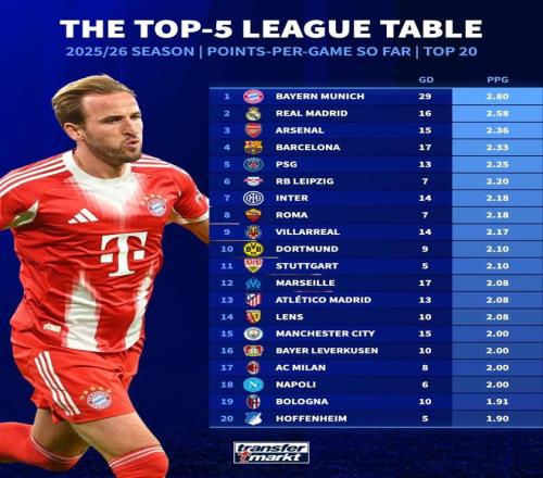 在本周末五大聯賽戰火重燃之前,《德國轉會市場》統計了本賽季五大聯賽球隊場均拿分的榜單,拜仁領跑,皇馬緊隨其後,阿森納排在第三。