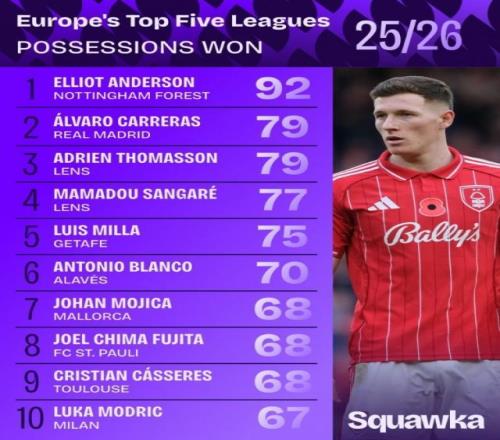 五大聯賽戰火即將重燃,數據機構squakwa也統計了本賽季至今的五大聯賽球員贏得球權次數情況,諾丁漢森林中場埃利奧特·安德森居首。本賽季五大聯賽贏得球權榜: