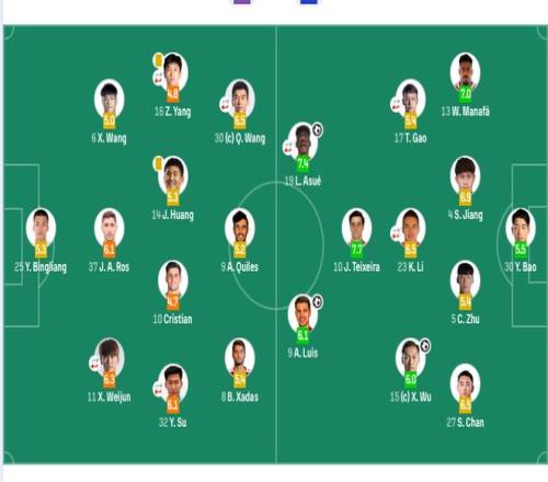 中場:10-特謝拉(F)、15-吳曦、17-高天意(68’7-徐皓陽)、23-李可(46’33-汪海健);