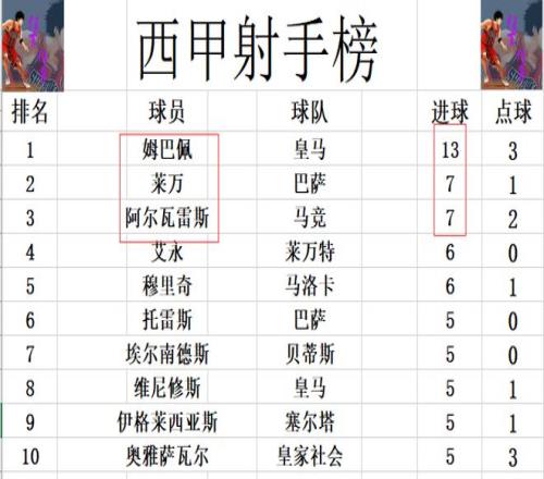 射手榜方麵,姆巴佩火力很猛,場均超過1球,12輪打入13球高居榜首。萊萬和阿爾瓦雷斯7球並列第2,艾永,穆裏奇6球並列第4。維尼修斯,埃爾南德斯,托雷斯等人5球剛好擠入前十。