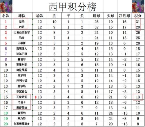 積分榜方麵,前12輪,皇馬3分優勢力壓巴薩領跑,本輪巴薩將在主場對戰勁敵畢爾巴鄂競技,皇馬則是客場對陣埃爾切。瓦倫西亞今天最後階段絕殺贏球拿下保級大戰,他們就暫時超過馬洛卡,奧薩蘇納上升到15位,輸球的萊萬特還是倒數第2陷在降級區內。