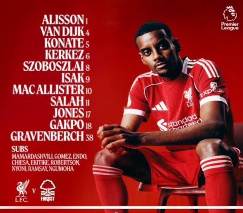 英超第12輪,利物浦主場迎戰諾丁漢森林,賽前利物浦首發陣容已經出爐,具體名單如下: 利物浦首發:阿利鬆 / 柯蒂斯·瓊斯、科納特、範戴克、凱爾凱茲 / 索博斯洛伊、赫拉芬貝赫、麥卡利斯特 / 薩拉赫、伊薩克、哈克波