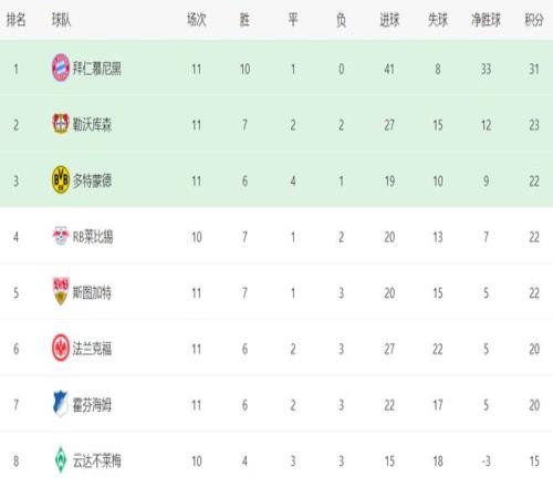 在積分榜上,拜仁牢牢占據榜首位置。拜仁10勝1平保持不敗,拿到了31分。勒沃庫森贏球之後,總積分達到23分,超越了多特蒙德,升到第2名,但與拜仁的差距依然很大,足足落後8分。多特蒙德以22分排名第3。萊比錫和斯圖加特也是22分,排名第4和第5。法蘭克福和霍芬海姆都是20分,排名第6和第7。不萊梅以15分排名第8。