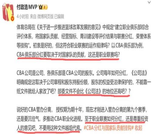 對此媒體人付政浩也發表了自己的意見:CBA俱樂部分紅要取決於對國家隊的貢獻,這還是職業聯賽嗎?說好的CBA管辦分離, 授權期為期十年,現在才剛進入管辦分離的第九個賽季,還是要沉住氣,多推動CBA職業化進程。至於職業聯賽如何分紅,還是尊重投資人的意見吧,不要用這種文件越俎代庖。