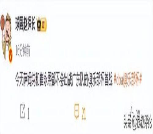 根據媒體人“球圈趙探長”報道,今天薩姆納和崔永熙都不會出戰廣東隊的俱樂部杯首戰。