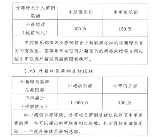 通知還規定,外籍球員年薪限額分別為:中超不超過稅前300萬歐元、中甲不超過稅前150萬歐元。外籍球員薪酬總額限額為:中超不超過稅前1000萬歐元、中甲不超過稅前400萬歐元。
