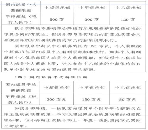 國內球員(含港澳台球員)平均薪酬限額分別為:中超不超過稅前300萬人民幣、中甲不超過稅前150萬人民幣、中乙不超過稅前50萬人民幣。