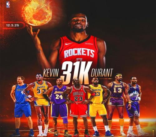 憑借這樣的表現,杜蘭特生涯總得分突破31000分大關,成為NBA曆史上第8位得分突破31000分大關的球員。