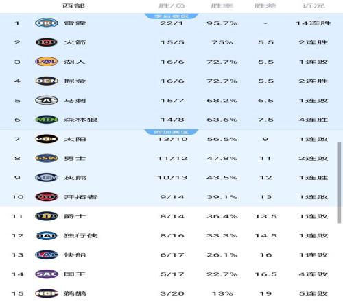 下麵是西部各隊排名,火箭2連勝後反超湖人,而掘金勝率已經和湖人相同,馬刺差湖人一個勝場差,未來很可能擠掉湖人進入西部前四。