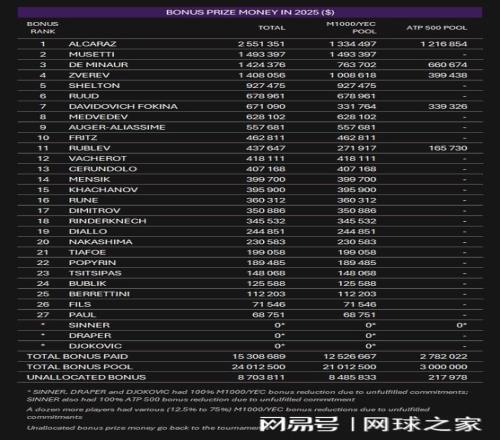 ATP針對大師賽和500賽事穩定參賽所設立的獎金,金額已可與大滿貫獎金相媲美。目前的獎金榜顯示,阿爾卡拉斯達到了一個裏程碑式的數字,然而由於違反ATP相關政策,他在曆史賽季收入上仍排在德約科維奇之後。
