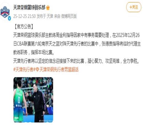 如今天津男籃官方公告顯示:“天津榮鋼籃球俱樂部主教練周金利指導因家中有事務需要處理,在2025年12月26日CBA聯賽第六輪南京天之藍對陣天津先行者的比賽中,張德貴指導將臨時代理主教練職務,指揮本場比賽。天津先行者將以堅定的信念迎接接下來的比賽,凝心聚力、攻堅克難,全力爭勝。”
