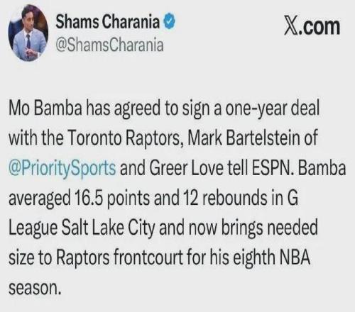 爆料王Shams:班巴以一年合同加盟猛龍。猛龍隊記Murphy對此表示,班巴的合同為無保障,本質上是一份為期12天的短合同。