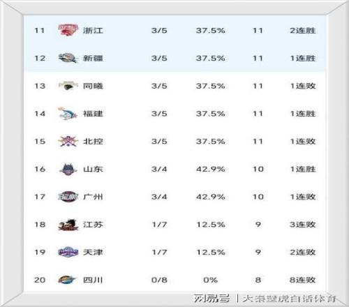 ⑤、新賽季8連敗的四川男籃仍然難嚐一勝,排名墊底,天津隊和江蘇隊同為1勝7負,排名倒數二三位。