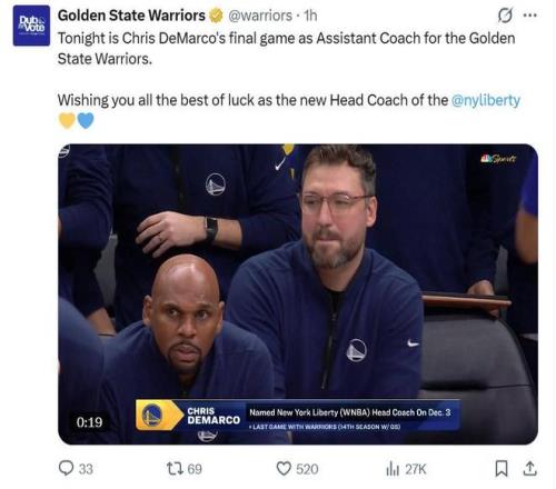 本場是克裏斯德馬科擔任勇士助教的最後一場比賽,勇士官方送上祝福,根據此前Shams報道,紐約自由人已聘請其為主帥。