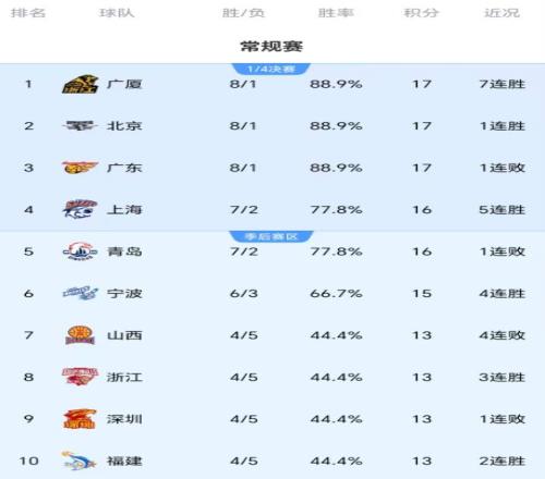從積分榜情況來看,衛冕冠軍廣廈隊憑借一波七連勝高居榜首,北京隊、廣東隊都是近期輸過比賽,分列第二、第三,爭冠第一集團白熱化。