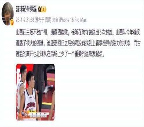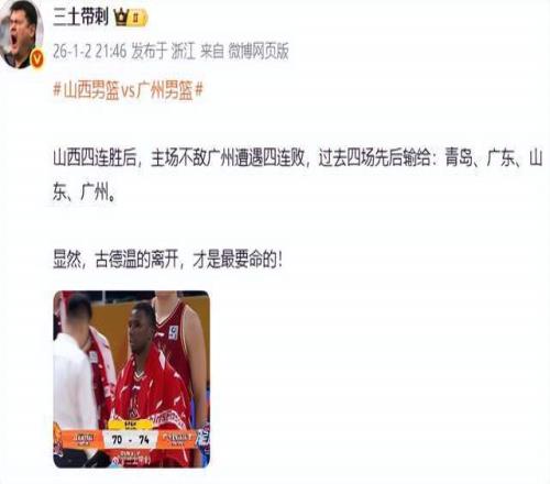 北京媒體人三土帶刺老師則表示:山西四連勝後,主場不敵廣州遭遇四連敗,過去四場先後輸給:青島、廣東、山東、廣州。顯然,古德溫的離開,才是最要命的!