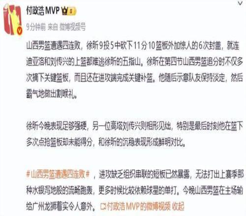 倒是媒體人付政浩老師很是中肯,他表示:山西男籃遭遇四連敗,徐昕9投5中砍下11分10籃板外加驚人的6次封蓋,就連迪亞洛和劉傳興的上籃都難逃徐昕的五指山。徐昕在第四節山西男籃追分時不僅多次摘下關鍵籃板,而且還在進攻端完成關鍵補籃。他隨後示意隊友保持淡定,然後霸氣地做出割喉禮。