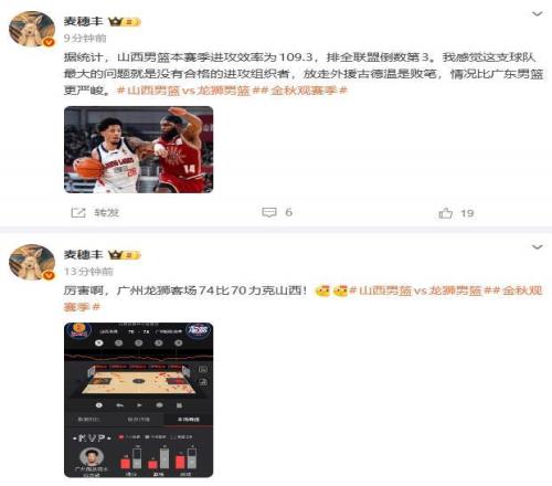 而廣東媒體記者麥穗豐老師則驚呼:厲害啊,廣州龍獅客場74比70力克山西!隨後,麥穗豐老師又表示:據統計,山西男籃本賽季進攻效率為109.3,排全聯盟倒數第3。我感覺這支球隊最大的問題就是沒有合格的進攻組織者,放走外援古德溫是敗筆,情況比廣東男籃更嚴峻。
