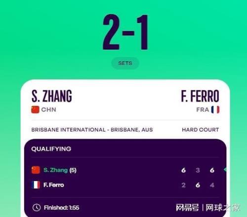 等到費羅從第五局開始緩過神後,越戰越勇的張帥根本沒給她翻盤的機會,以6比2輕鬆拿下了第一盤。