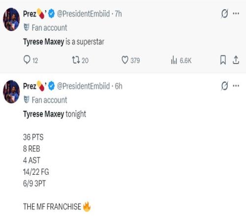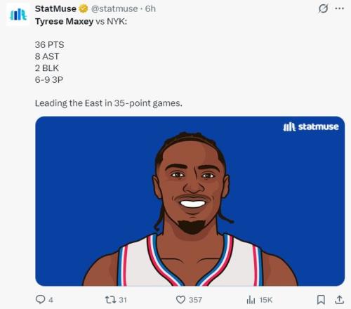 此役馬克西全場比賽37分鍾,22中14,三分9中6,罰球4中2,拿到36分8籃板4助攻1搶斷2蓋帽,命中率63.6%,三分命中率66.7%,他的35+場次在本賽季東部排名第一。