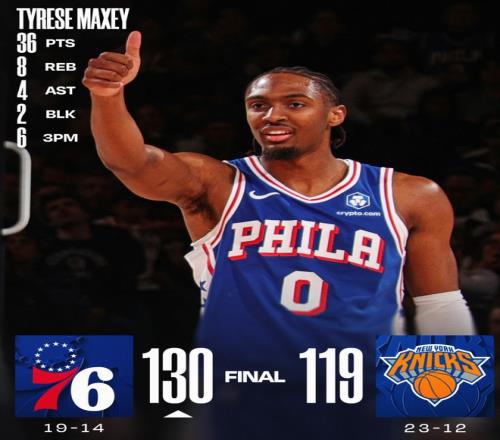 北京時間1月4日,費城76人客場130-119大勝紐約尼克斯拿到三連勝。這場比賽費城一直都手握領先,尼克斯此役讓唐斯、米羅 都複出還是無法擊敗已經形成默契的費城新三巨頭,恩比德、埃奇庫姆、馬克西都拿到20+的數據。