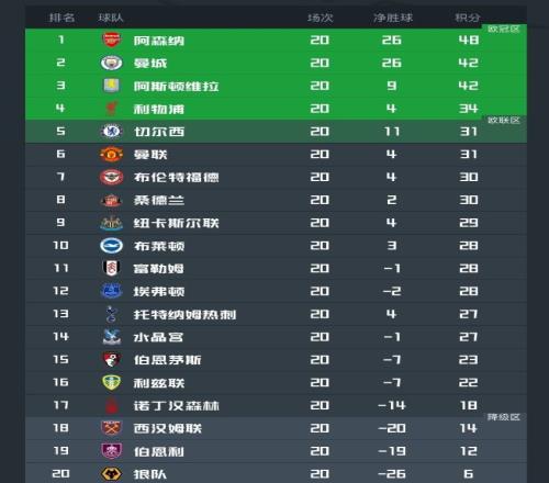 北京時間1月5日淩晨,隨著切爾西在傷停補時階段絕平曼城,英超第20輪的所有賽事全部結束;在最新的積分榜上,曼城連續2輪丟分,已經被阿森納拉開了6分的優勢;狼隊贏得賽季首場勝利,終結了前19輪不勝的英超紀錄;而第5到第14的球隊之間僅僅相差4分。