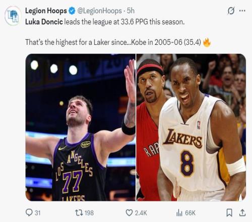 6.東契奇場均33.6分是05-06賽季湖人隊史後最高。